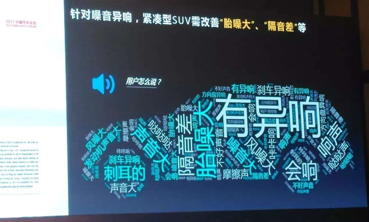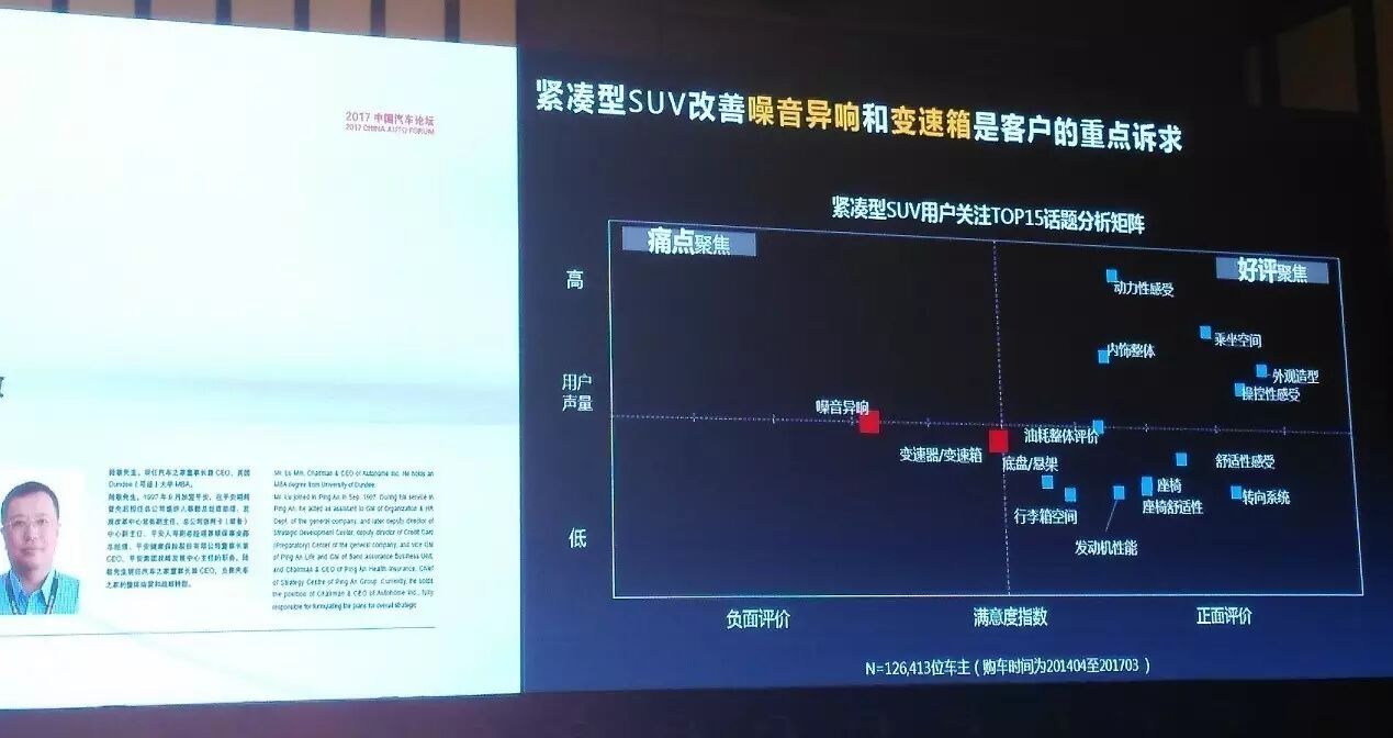 最后一块是用户需求深度洞悉。比如举个例子来讲,紧凑型的SUV市场未来的方向,从数据上来看舒适型、操控性是用户更加关注的。它的坐标是PPH,就是百车的抱怨数。那么再往上走,所以需要引起厂家的关注。我们这儿把所有的东西放在一块儿,比如说紧凑型SUV噪音和变速箱,是用户重点诉求。这就是通过我们的语义分析,我们把它抓出来,变成正面评价和负面评价。如果在右下方,都是好的,就是用户的反馈声音很大,而且都是正面的。如果是左上方,反馈是差的,声音很大,都是负面的。我们对每款车都有分析,某一个点点进去,就会知道这个噪音。噪音用户怎么讲的,各种各样的说法都会出来。并且可以有追诉,比如有异响,所有用户遇到异响怎么表述的,都可以知道。这样可以帮助厂家做产品更新的时候,改善它的产品。