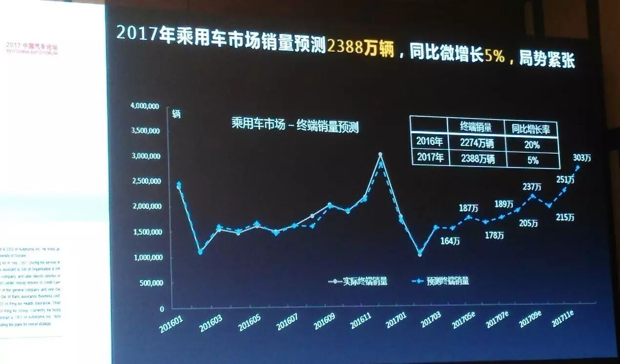 下面我想讲一下,参加这次论坛特别做了一些准备,对中国汽车行业的应用讲一下。可能很外行,讲错的部分请批评执正。第一个销量的预测,这是对中国整体2017年乘用车销量的预测,我们预测同比增长5%左右,去年是大概20%,今年我们预计是5%左右。我们对每个品牌、每一款车都可以做预测。我敢讲他至少有三个月在我这儿预热,看你这款车的人越多,我们的模型它就会滚出来你的车下面的销量会涨。如果最近关注这款车的人少了,我们的模型会告诉厂家,你的这款车可能销量未来几个月可能会下降。所以我们把所有的乘用车放在一起,做了一个大的模型。