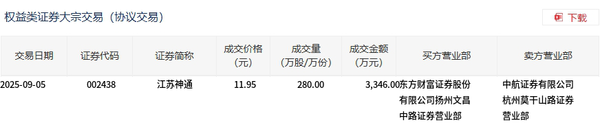 9月5日,江苏神通大宗交易成交280万股,成交额3346万元,占当日总成交额的19.87%,成交价11.95元,较市场收盘价13.52元折价11.61%。