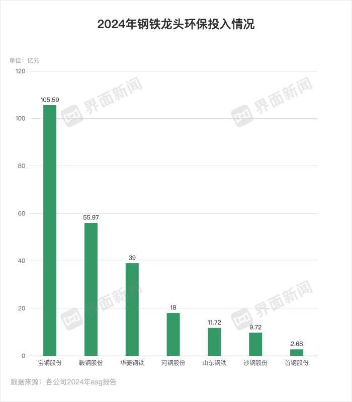 华菱钢铁、河钢股份、山东钢铁、沙钢股份、首钢股份五家钢企环保投入合计超81亿元,仍不及宝钢股份一家。