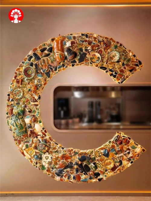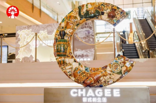 在霸王茶姬的品牌空间资产缔造中,容品牌紧紧围绕「汉唐⽓象×茶路」的⽂化IP进⾏创作。 就拿上海首店来说,墙面将唐三彩与品牌首字母“C”结合,碰撞出极强的艺术张⼒。