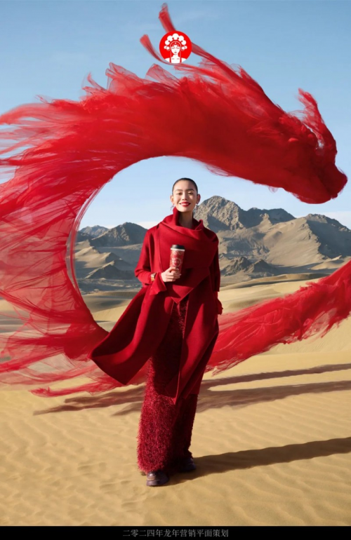 在“神性”表达上,容品牌在龙年营销方面以“中华第一龙”红山玉龙为原型,⼗⼆⽣肖共同构成红⼭⽟⻰的外形,杯体将“⻰+星空”的神秘恢弘的⽓象进⾏组合,采⽤曼陀罗的中⼼制式,为⻰带来更多中式浪漫的想象。,不仅让春节营销跳出传统团圆叙事,更保留为产品的经典杯型。