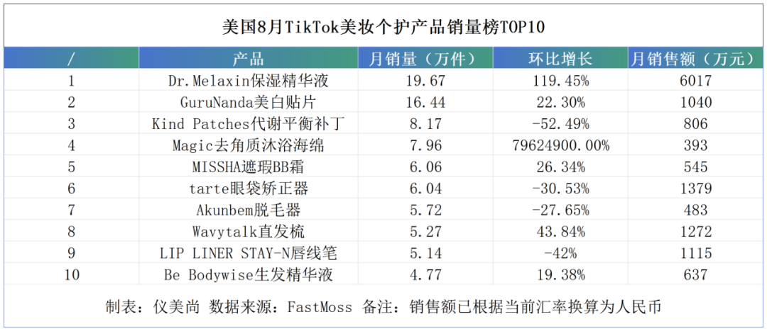 此番取代Kind Patches代谢平衡补丁占据榜单第一位的是Dr.Melaxin保湿精华液。数据显示,Dr.Melaxin保湿精华液7月仅排名第三,8月该产品的销量环比大涨119.45%,共售出19.67万件,销售额6017万元,拿下美区销量和销售额双第一。
