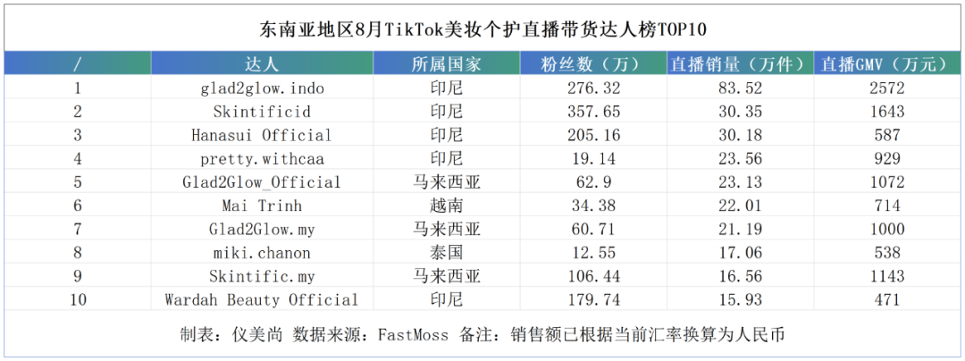 当月,只有5位印尼达人上榜,比7月份少了1位,相比6月份则少了5位。但值得注意的是,尽管上榜的印尼达人数量大幅下滑,但榜单前4名,依然被印尼达人所占据。其中,位居TOP1的glad2glow.indo,8月份总销量83.52万件,销售额2572万元。
