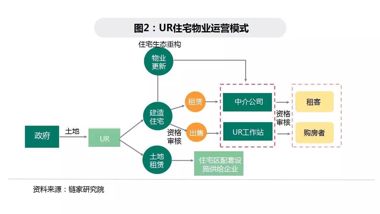 日本住宅公团建立之初服务于住房困难的中低收入阶层,实施大规模的住房开发。其后又历经了宅地开发公团、地域振兴整治公团、住宅·都市整治公团、地方都市开发整治部门以及都市基础整治公团等阶段,最终于2004年改组为独立法人公司,自负盈亏。运营原则上,UR不和民企竞争,UR不从事民企的业务,不做住宅开发,仅合理运营现有租赁住宅,从事民企不愿从事的事业,比如老人出租公寓等。目前,该公司隶属于国土交通省。