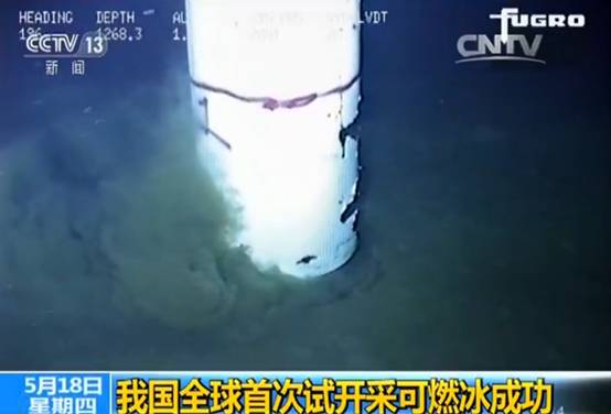 5月10日起,国土资源部中国地质调查局从中国南海神狐海域水深1266米海底以下203-277米的天然气水合物矿藏开采出天然气。