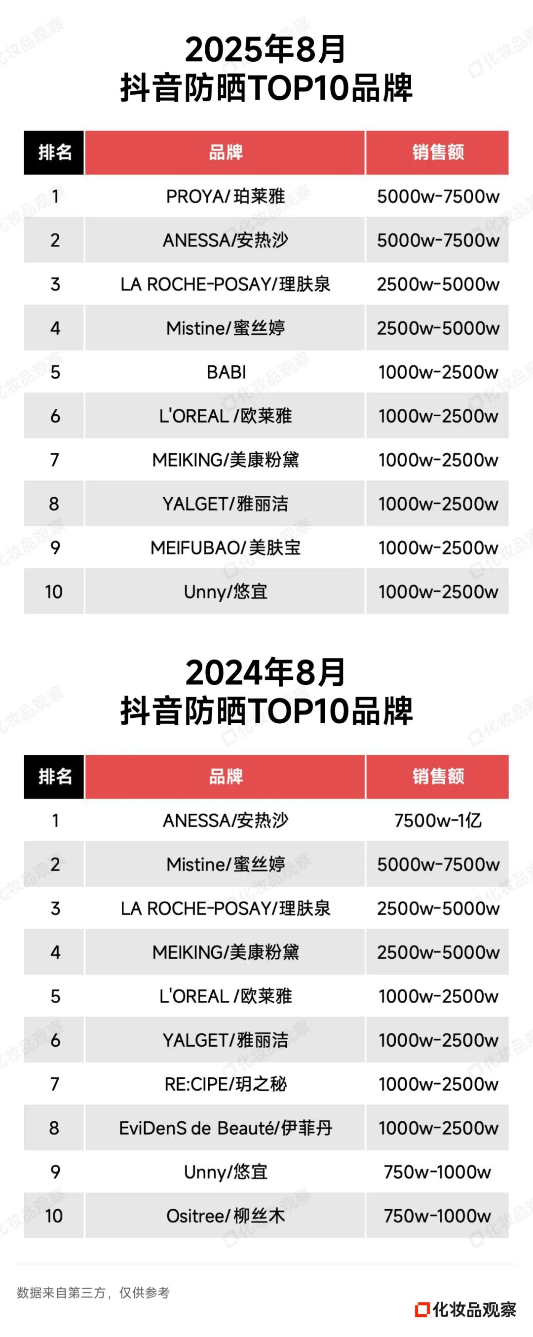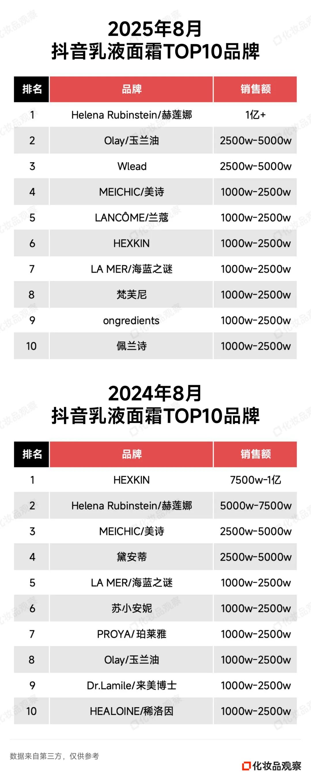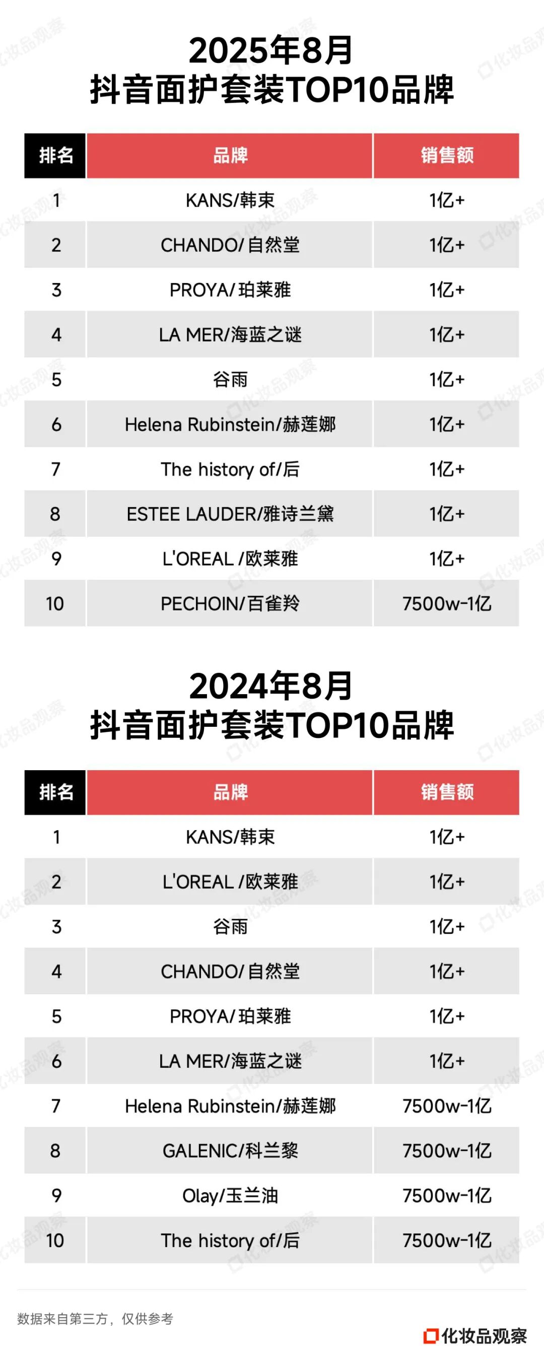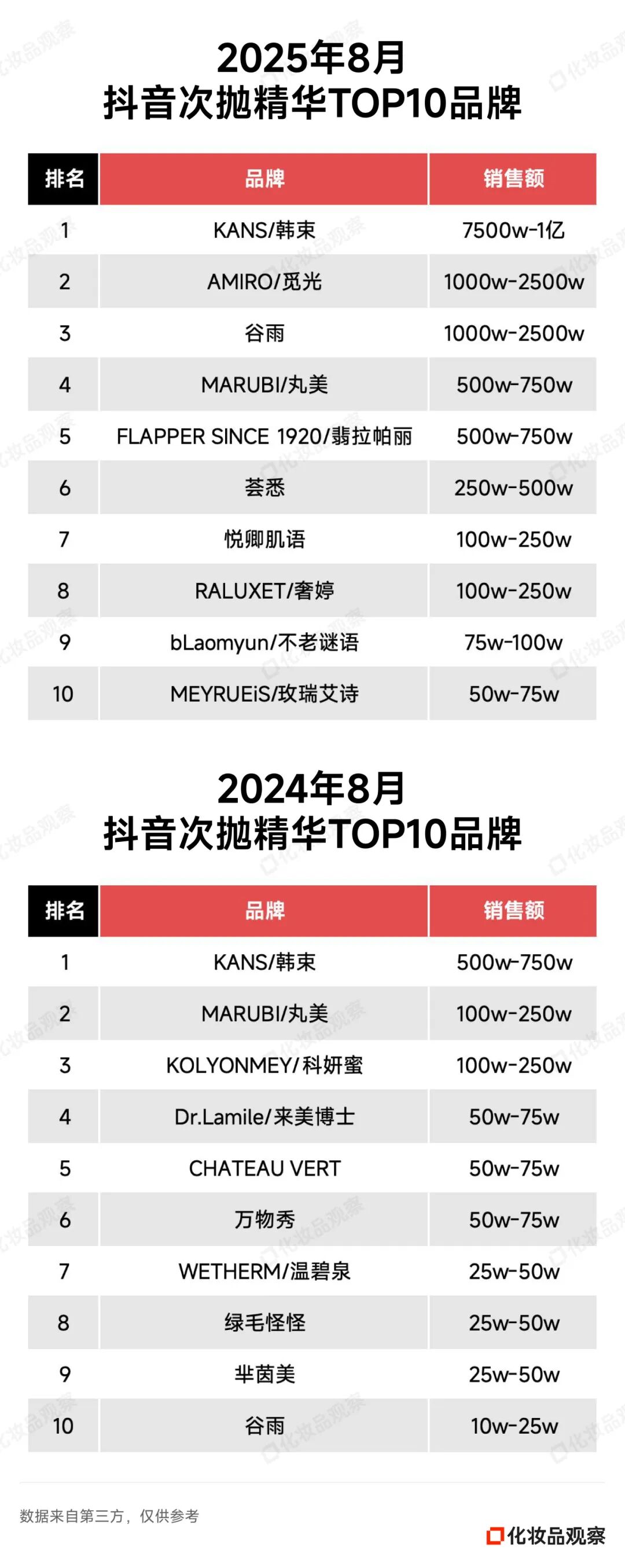2025年8月&2024年8月 抖音美妆/美容护肤/彩妆香水美妆工具TOP20