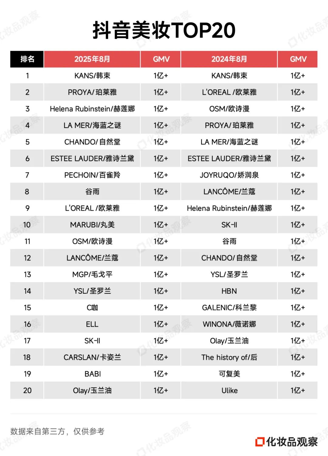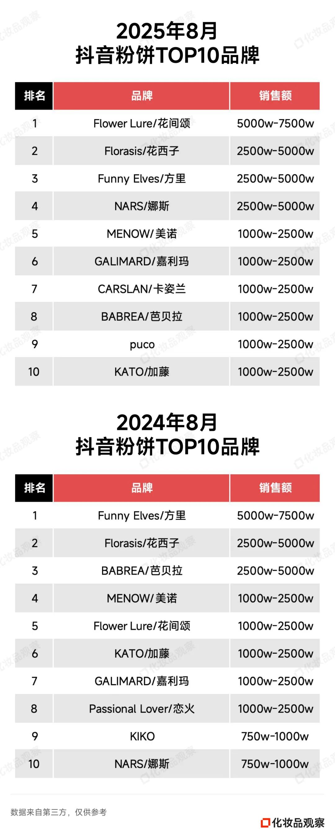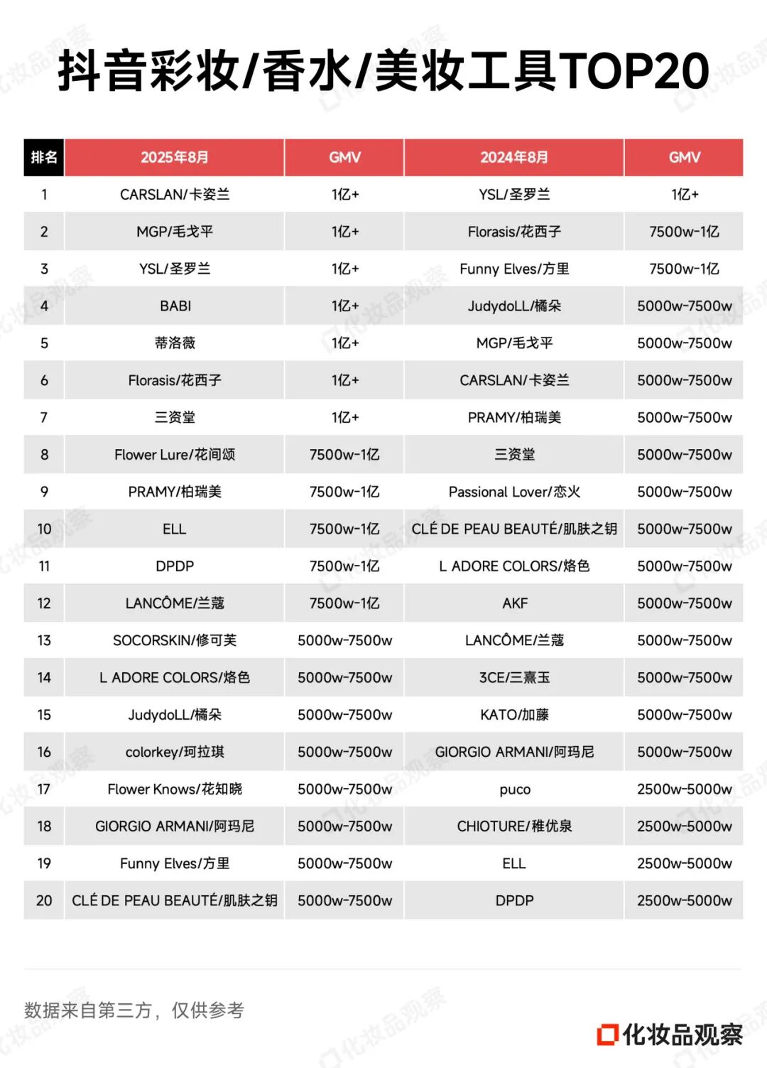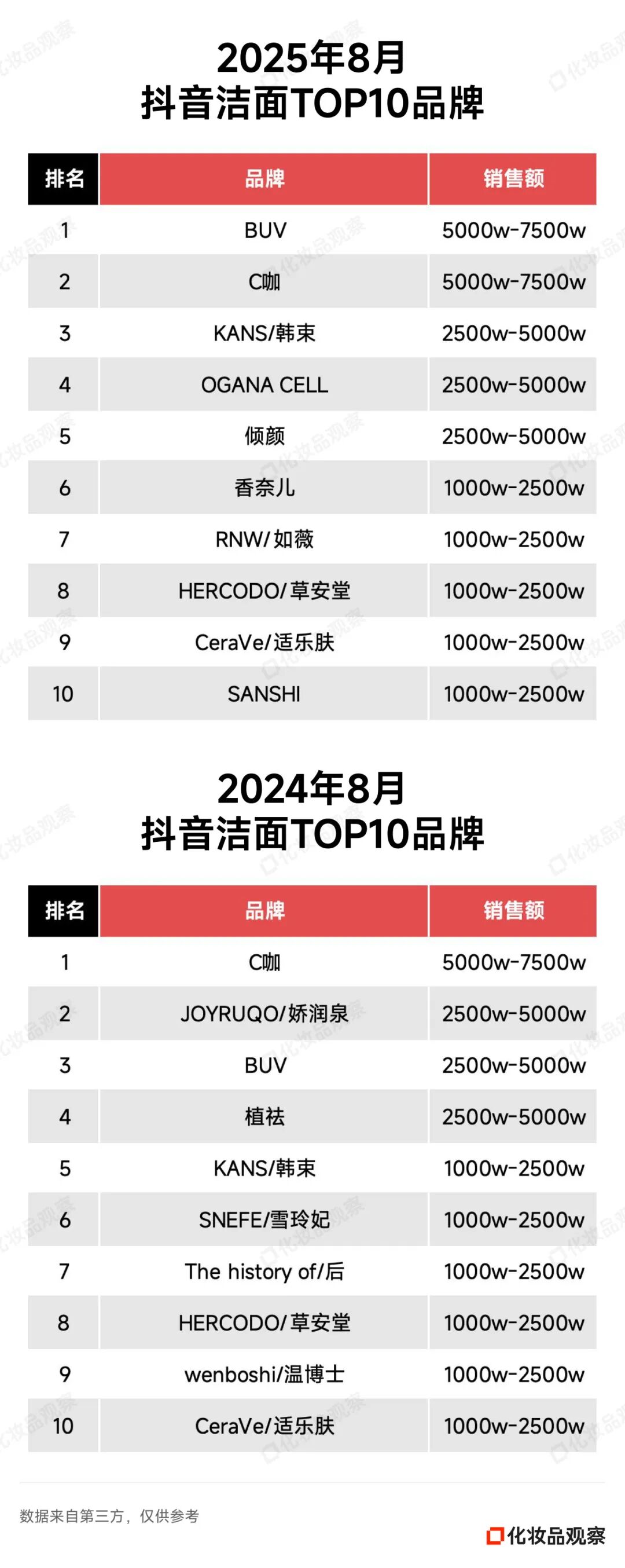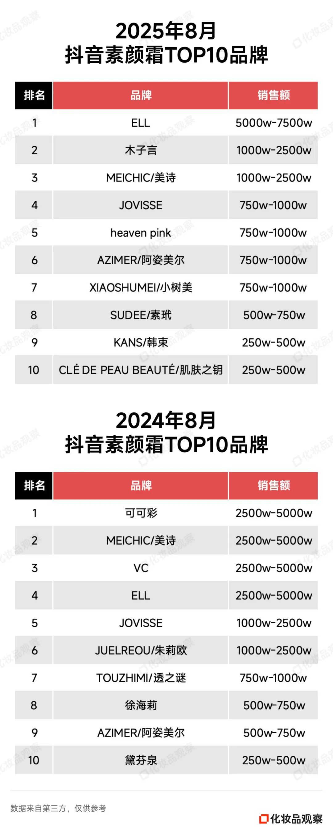 2025年8月&2024年8月 抖音美妆/美容护肤/彩妆香水美妆工具TOP20