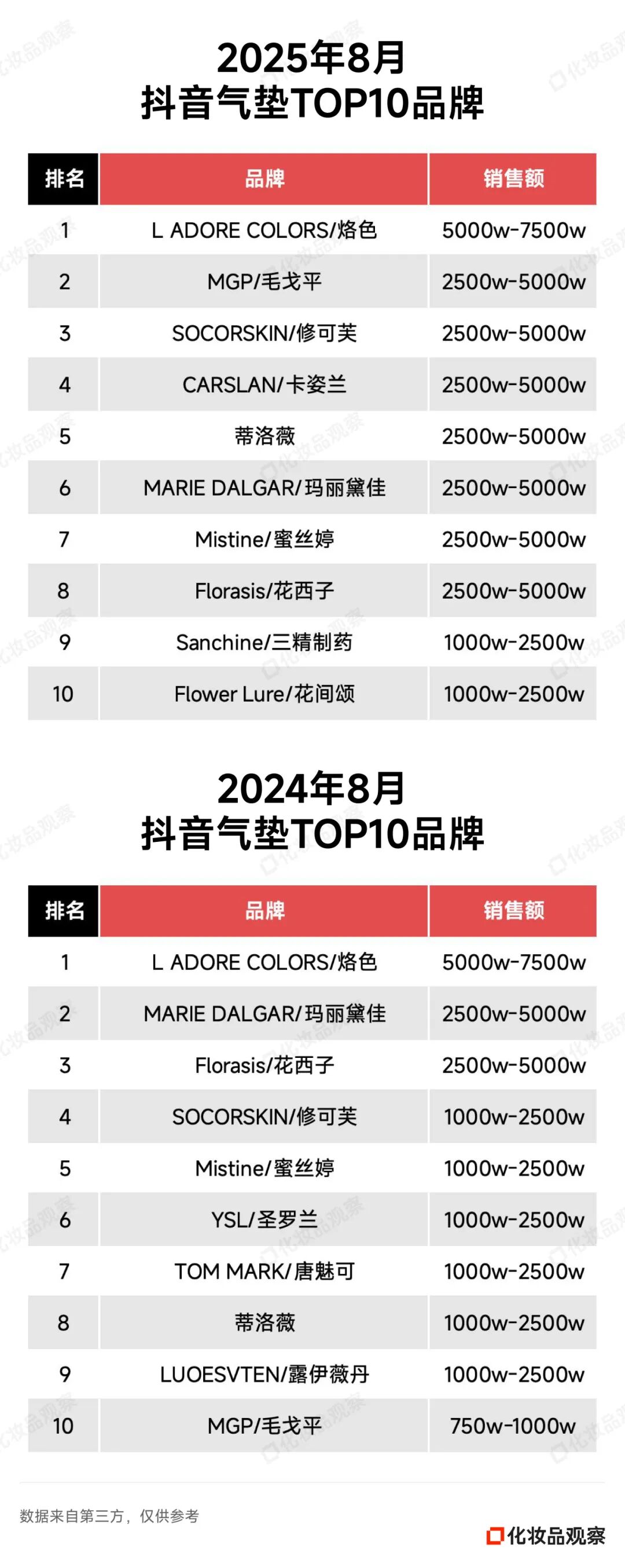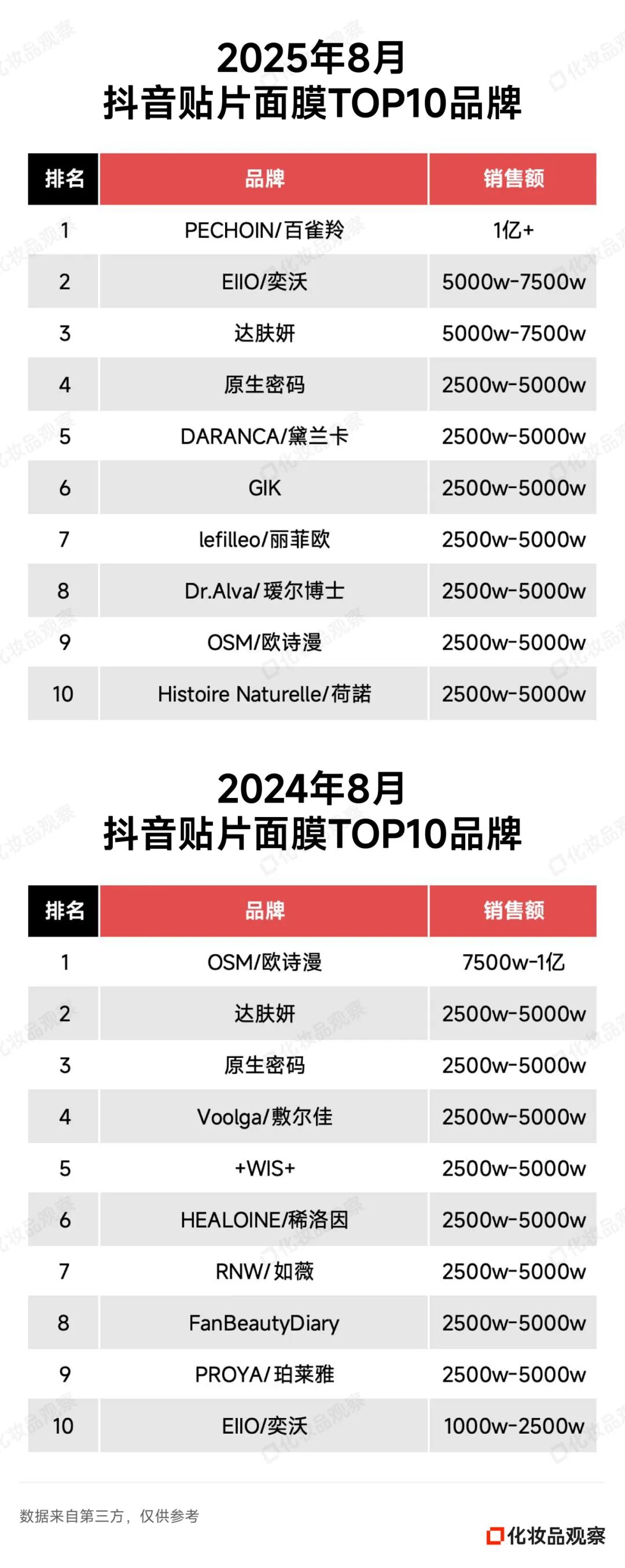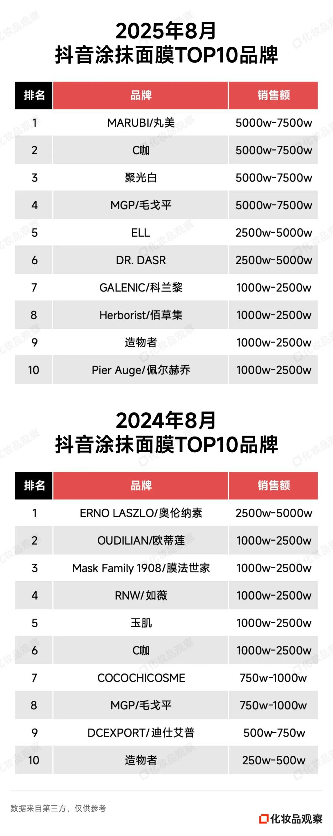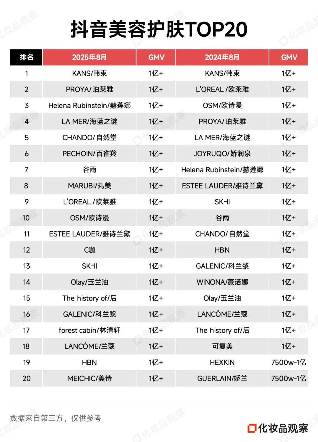 2025年8月&2024年8月 抖音美妆/美容护肤/彩妆香水美妆工具TOP20
