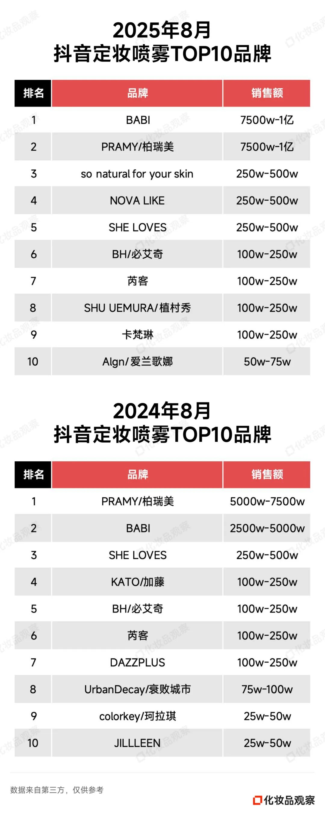 但8月份,BABI一举夺下定妆喷雾第一位置,市占率44.7%;柏瑞美的市占率为41.5%。去年同期(2024年8月),柏瑞美市占率59.2%,位列第二的BABI是25.3%。