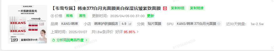 值得关注的是,在此之前韩束已经上架了377白月光面膜,主打美白保湿抗皱紧致,韦雪也是这款产品的销售主力,月度贡献的GMV均在千万级以上。