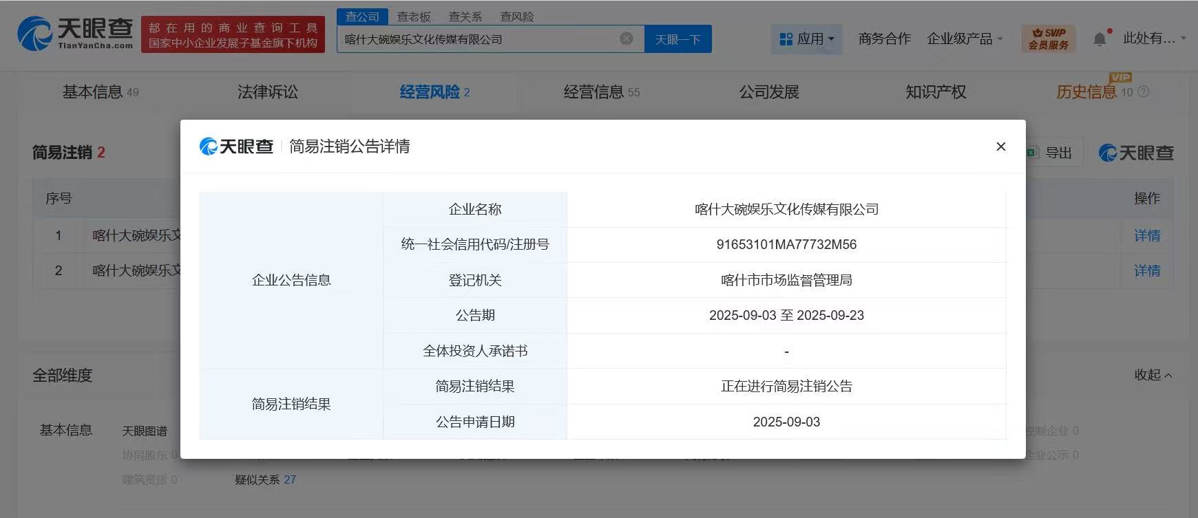 9月8日消息,天眼查App显示,近日,喀什大碗娱乐文化传媒有限公司新增一则简易注销公告,公告期自9月3日至9月23日。
