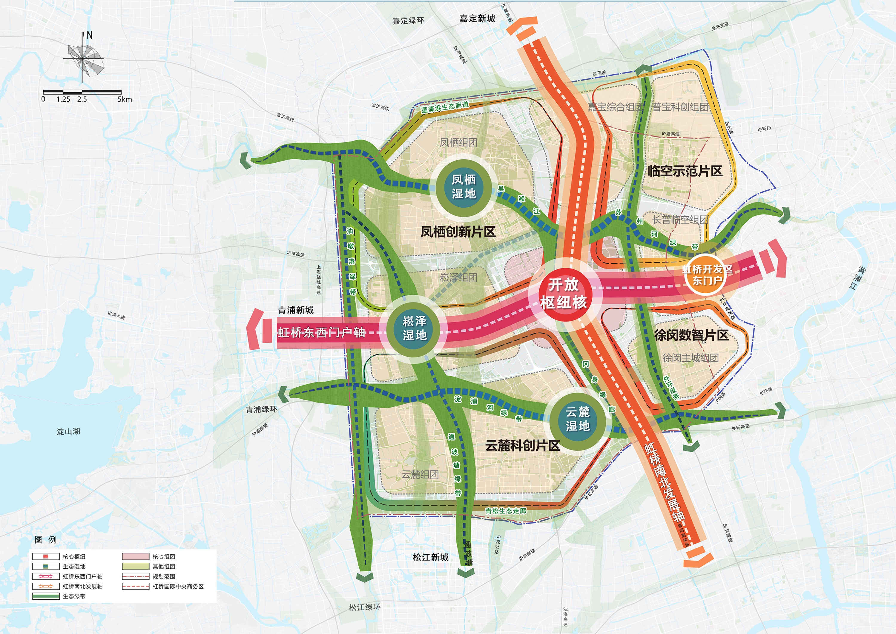 “五带”是依托吴淞江、淀浦河、油墩港、通波塘和外环绿带,塑造五条结构性生态绿带;“三湿”是沿生态绿带,营造凤栖、崧泽、云麓三片体现江南水乡特色的湿地空间;“八组团”是围绕核心区重点产业功能、重要湿地等特色节点,形成功能差异化发展的八个组团,实现空间品质和资源要素的全面提升。