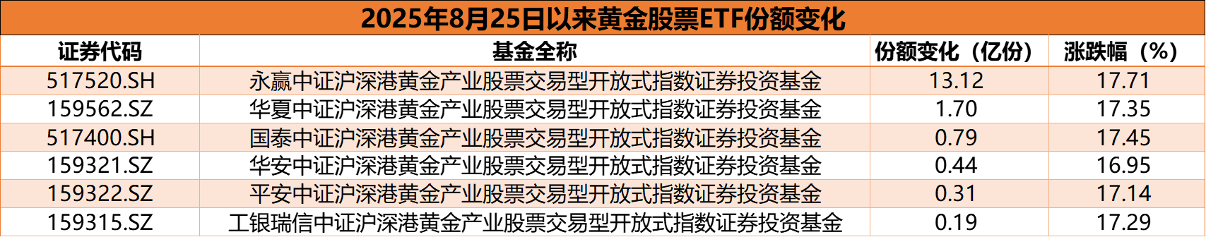 具体来看,永赢中证沪深港黄金产业股票ETF(517520.SH)和华夏中证沪深港黄金产业股票ETF(159562.SH)是资金流入最多的两个产品,8月25日以来累计净流入份额分别为13.12亿份和1.7亿份。