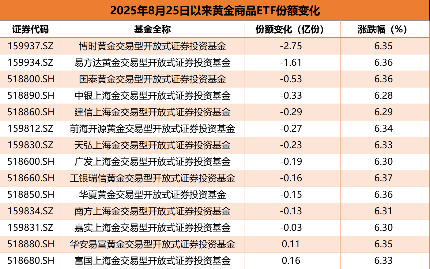 商品型黄金ETF则整体呈现出净流出,8月25日以来博时黄金ETF(159937.SZ)和易方达黄金ETF(159934.SZ)份额分别净流出2.75亿份和1.61亿份。