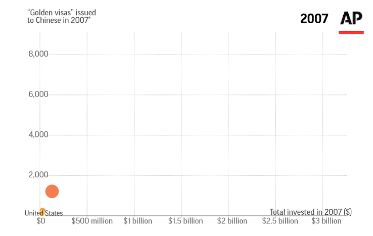 美联社列举了过去十年给中国投资者签发数量最多的五个国家,排在首位的是美国。过去十年,美国移民局通过EB-5项目给中国发放了43448张绿卡。邻国加拿大的吸引力也不小,共有35278张绿卡通过投资债券计划签发给中国人。因为涉及房产投资,葡萄牙的“黄金签证”项目受到中国人的欢迎,共有7875人因此获得绿卡。匈牙利债券计划和澳大利亚“重要投资者”项目分别给中国人发放了6405和4640张绿卡。