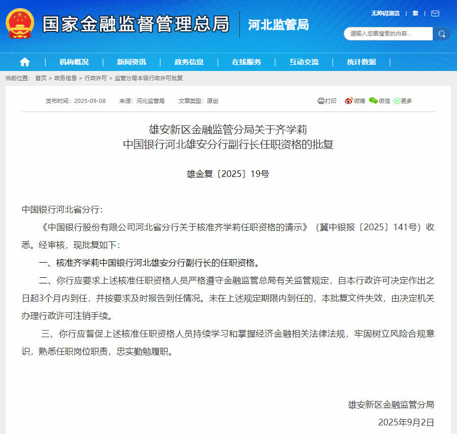 据国家金融监督管理总局河北监管局的批复文件显示,雄安新区金融监管分局核准齐学莉中国银行河北雄安分行副行长的任职资格。