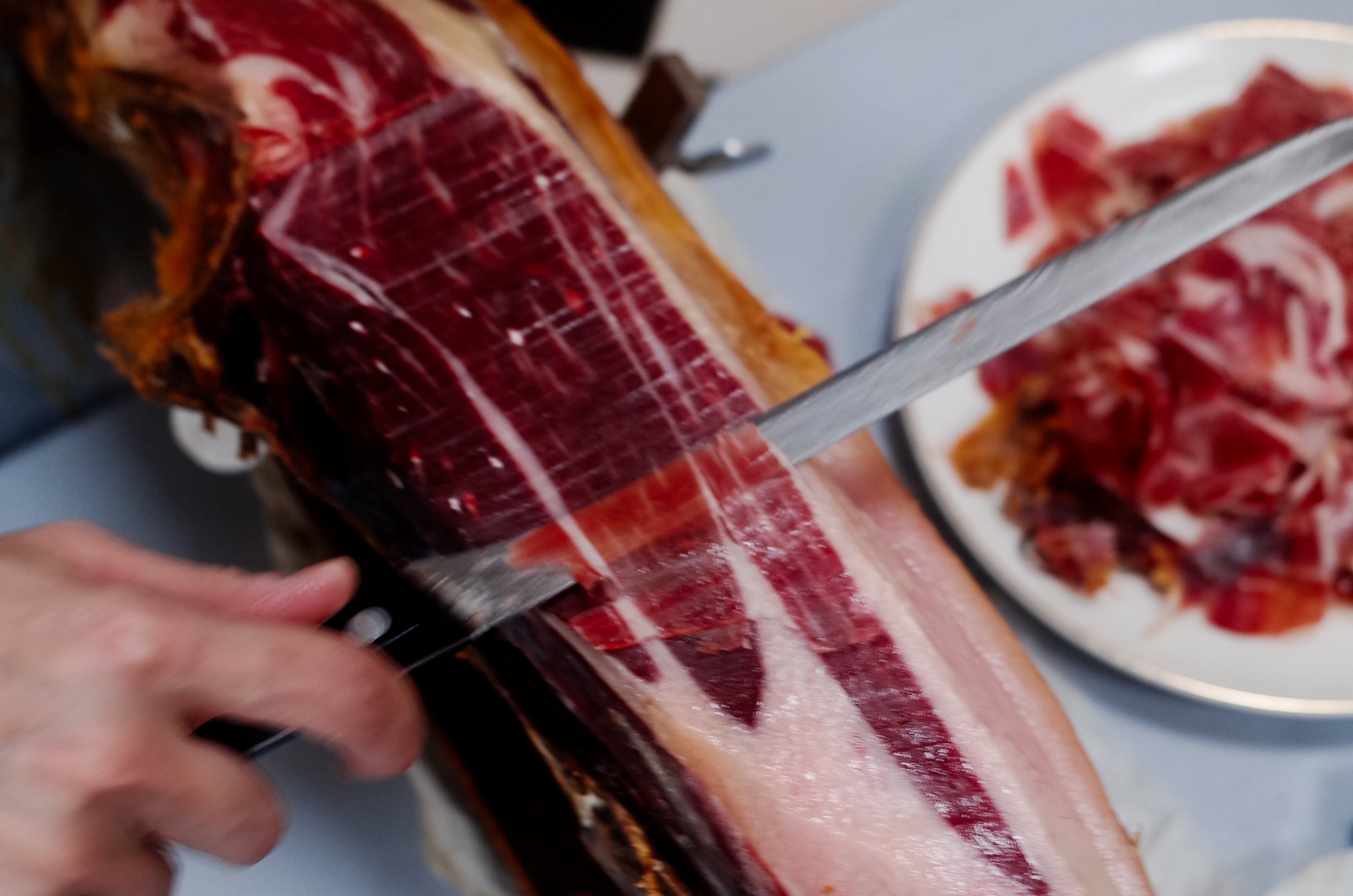 让这一猪种声名远播的,当然是jamón ibérico——伊比利亚火腿。含着丝丝缕缕半透明油脂的深红色火腿薄片,口感浓郁又细腻绵密,甜美的脂肪带着坚果和森林香气流动在肉质中。萨拉曼卡省的这片风水宝地,海拔千米,干燥冷冽,正是伊比利亚火腿的三大原产地之一,是享誉世界的火腿厂牌费尔明(Fermín)与小何塞(Joselito)的故乡。