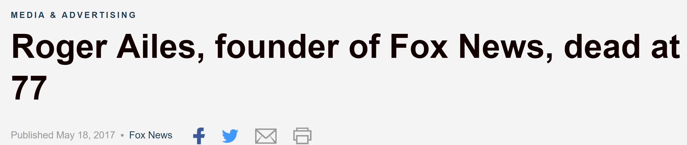 【福克斯新闻创始人去世 曾丑闻缠身】周四上午,福克斯新闻创始人之一、前CEO罗杰·艾尔斯(Roger Ailes)去世,终年77岁。艾尔斯于1996年创立了福克斯新闻,并将其发展成了美国第一大有线新闻网。他曾是几届美国总统的亲信、著名的金牌主持,是传媒界公认的大师级人物。但因卷入涉嫌性骚扰包括明星主播在内多名下属的丑闻,艾尔斯于去年7月黯然辞职,他本人强烈否认这些指控。