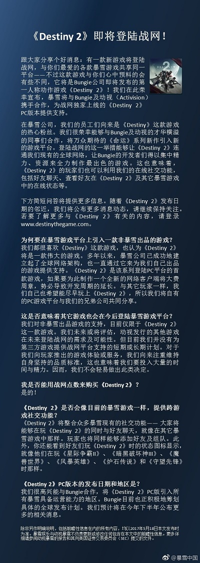 在刚刚结束的《命运2》发布会上,暴雪CEO Mike Morhaime宣布,《命运2》PC版将独占登陆暴雪战网,未来将引入所有具有战网运营能力的地区,这代表首款非暴雪游戏将在战网出现。