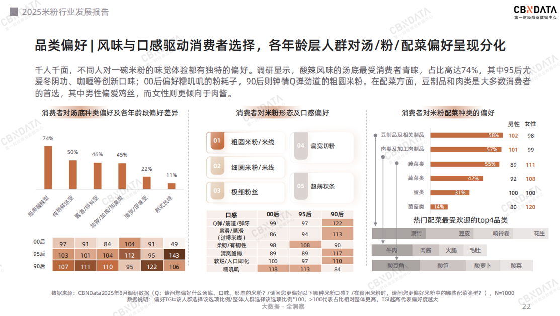 在“好吃”这一看似简单的追求下,不同人群的偏好呈现出显著分化。在风味上,酸辣味最受消费者青睐,占比高达74%。在米粉形态和口感上,代际差异尤为明显:90后是“粗圆粉”的忠实拥趸,偏爱Q弹劲道的口感;95后则更钟情于“细圆粉”,追求柔韧有弹性的体验;而00后则对“糯叽叽”的独特口感表现出强烈兴趣。在配菜选择上,豆制品是大众首选,其中腐竹、豆皮、响铃卷位列前三;性别差异也悄然存在,男性更偏爱肉类,女性则更青睐清爽的腌菜。