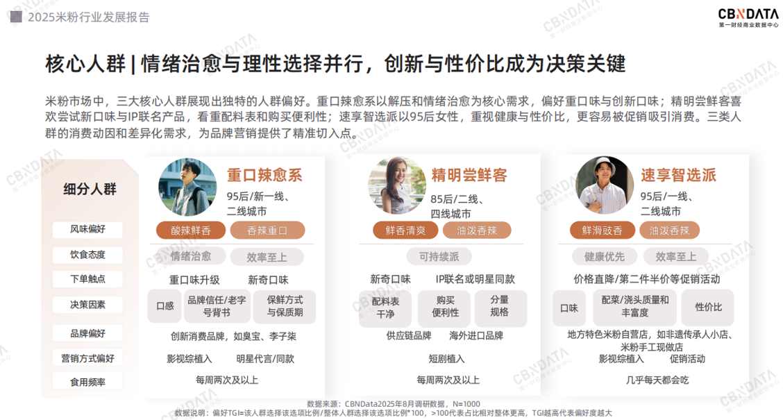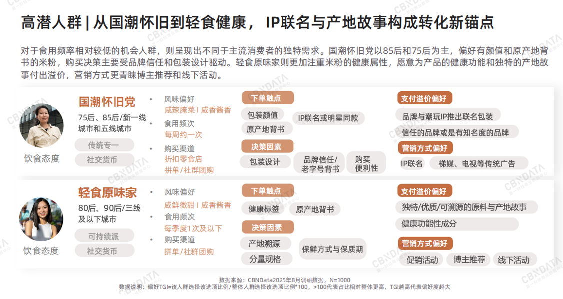 “国潮怀旧党”以75后和85后为主,TA们偏好咸辣、酱香等传统口味,信赖老字号,愿意为有情怀、有颜值和具备原产地背书的产品买单,IP联名和品牌故事是打动他们的有效方式。另一类是“轻食原味家”,以80、90后为主,TA们是健康主义的践行者,关注清洁配料表和健康功能性,独特、可溯源的产地故事和健康卖点更能激发其购买意愿。五大消费人群差异化的价值主张与决策路径,也成为驱动米粉产业持续创新的核心动力。