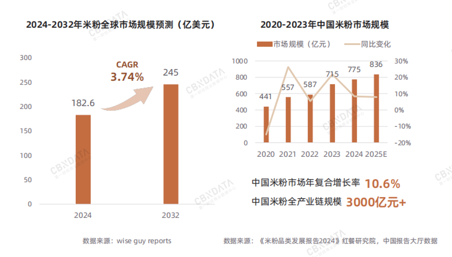 数据显示,全球与中国米粉市场的蓬勃态势,2024年后全球米粉市场将以3.74%年复合增长率稳步扩容。中国市场更是成为增长引擎,2025年规模超800亿元,全产业链规模已突破3000亿元。