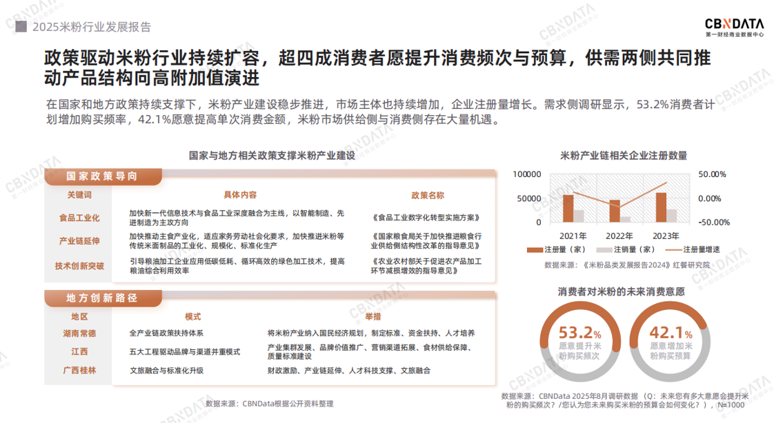 此外,供需两侧双重助力,成为推动米粉行业发展的关键力量。一方面,国家政策从食品工业化、产业链延伸到技术创新突破,地方政策摸索出创新路径,如湖南常德实行全产业链政策扶持体系,多维度为米粉产业建设“搭台”,企业注册量也随之逐年攀升。在需求侧,超五成消费者计划提升购买频次,四成多愿提高单次消费金额,消费意愿增强也为行业增长注入强劲动力。