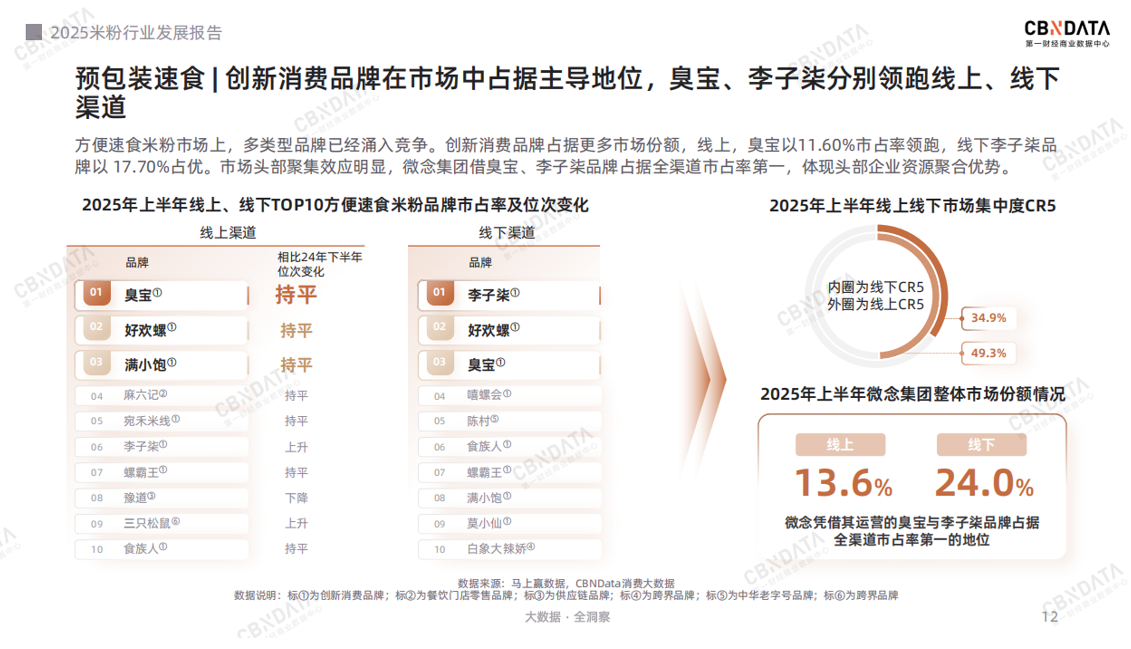 随着米粉的消费场景和市场边界持续拓宽,作为米粉产业的核心板块之一,预包装速食米粉也逐渐形成了初步的市场竞争格局,且头部品牌效应日益增强。从市占表现来看,2025年上半年臭宝以11.6%的份额占据线上渠道榜首,线下则由李子柒品牌以17.7%领先。