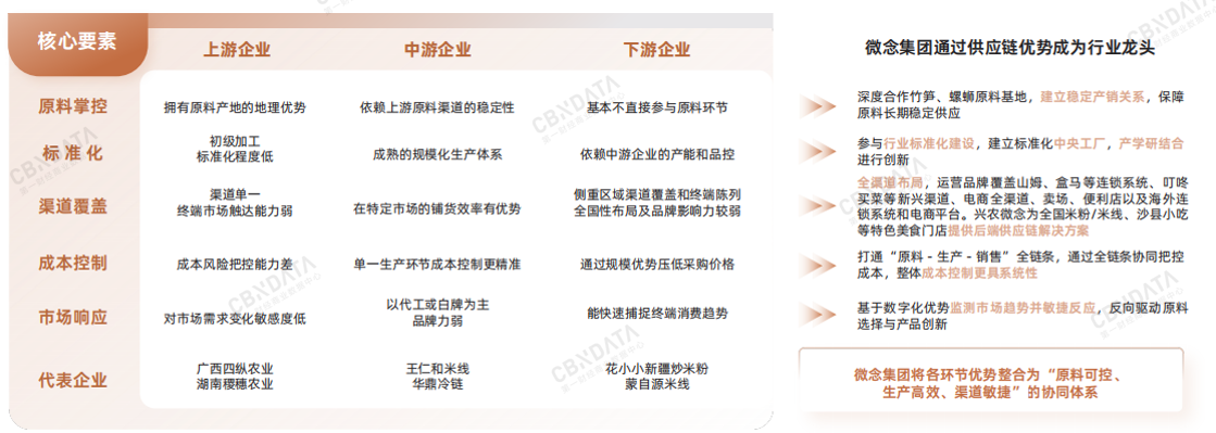这背后是米粉企业的核心竞争力从单一环节的绝对性优势转向在完整产业链上的供应链优势整合。从这一维度上来看,在线上线下市占率第一的优势之外,微念集团还通过“原料-生产-销售”一体化运营,有效整合了产业链资源,达成成本优化与效率协同,在米粉产业全链条上确立了其行业龙头的地位。