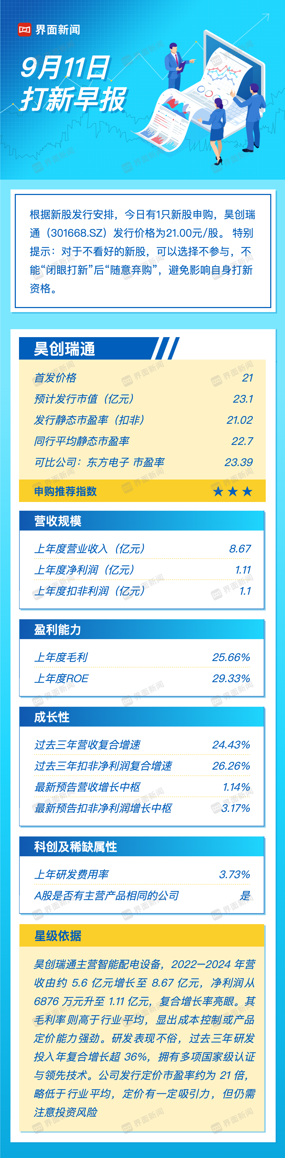 根据新股发行安排,今日有1只新股申购,昊创瑞通(301668.SZ)发行价格为21.00元/股。