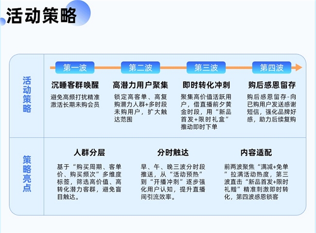 泰兰尼斯以 “购买周期、客单价、购买频次” 等标签分层用户,筛选高价值客群避免盲目触达,分四波推进:唤醒沉睡客群、聚集高潜力用户、冲刺即时转化、留存购后用户。