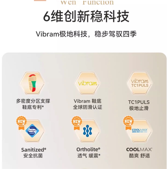比如学步期的 “稳稳鞋” 系列,核心依托 “Vibram 极地科技” 打造 “6 维创新稳科技”,上市不到一年销量破亿。其通过多密度分区支撑鞋底专利提供精准支撑、Vibram 防滑认证鞋底搭配 TC1PULS 极地止滑技术减少打滑风险、Sanitized® 技术保障足部卫生、Ortholite® 材质实现透气缓震、COOLMAX® 材质加速透气排湿,从支撑、防滑、抗菌、透气、缓震多维度,全方位保障儿童在四季不同场景下的稳定、舒适与健康穿着体验。