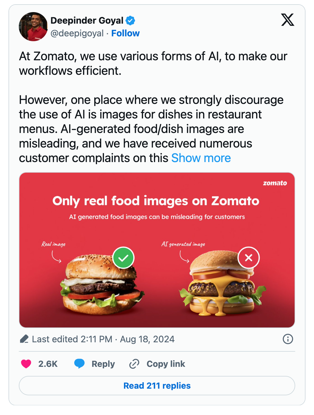 在印度版“大众点评”Zomato 上,因为平台被 AI 生成的餐食图片“入侵”,而收到大量顾客投诉。其首席执行官 Deepinder Goyal 不得不在 X 上表示,平台将不接受任何 AI 生成的菜品图片,同时该禁令也适用于平台的营销团队。