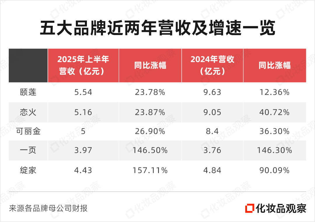 同样,诞生时间早、但于2021年才“正式发力”的恋火,近年来也呈快速上涨之势,2023年及2024年涨幅分别达到125.14%及40.72%,2024年营收也已达到9.05亿元,离10亿级仅一步之遥。今年上半年,恋火增速达到23.87%,年内突破10亿或已“板上钉钉”。