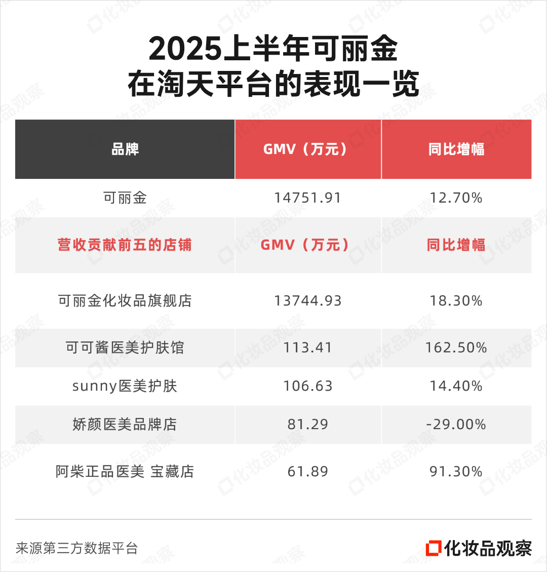 1.在淘天平台,主要营收来自于官方旗舰店。以可丽金为例,其上半年在淘天平台的GMV为1.48亿元,来自旗舰店的GMV为1.37亿元,占比高达93.17%。