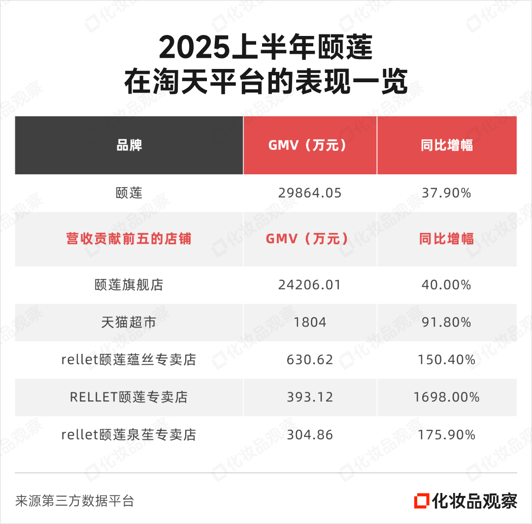 2.大部分品牌,开始大力发展分销渠道。譬如,颐莲上半年在淘系平台的GMV为2.99亿元,贡献前五的店铺里,有一家名为“RELLET颐莲专卖店”的店铺,上半年贡献营收393.12万元,同比涨幅高达1698%。