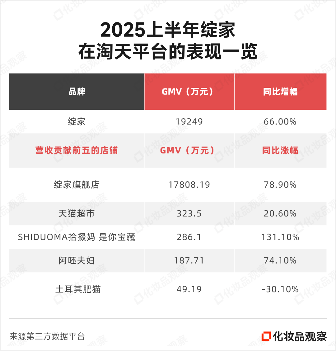又如绽家的成功,为若羽臣这样的头部美妆TP商带来了新的发展思路。2025年上半年,若羽臣自有品牌实现营业收入6.03亿元,占公司营业收入的45.75%,已接近一半。