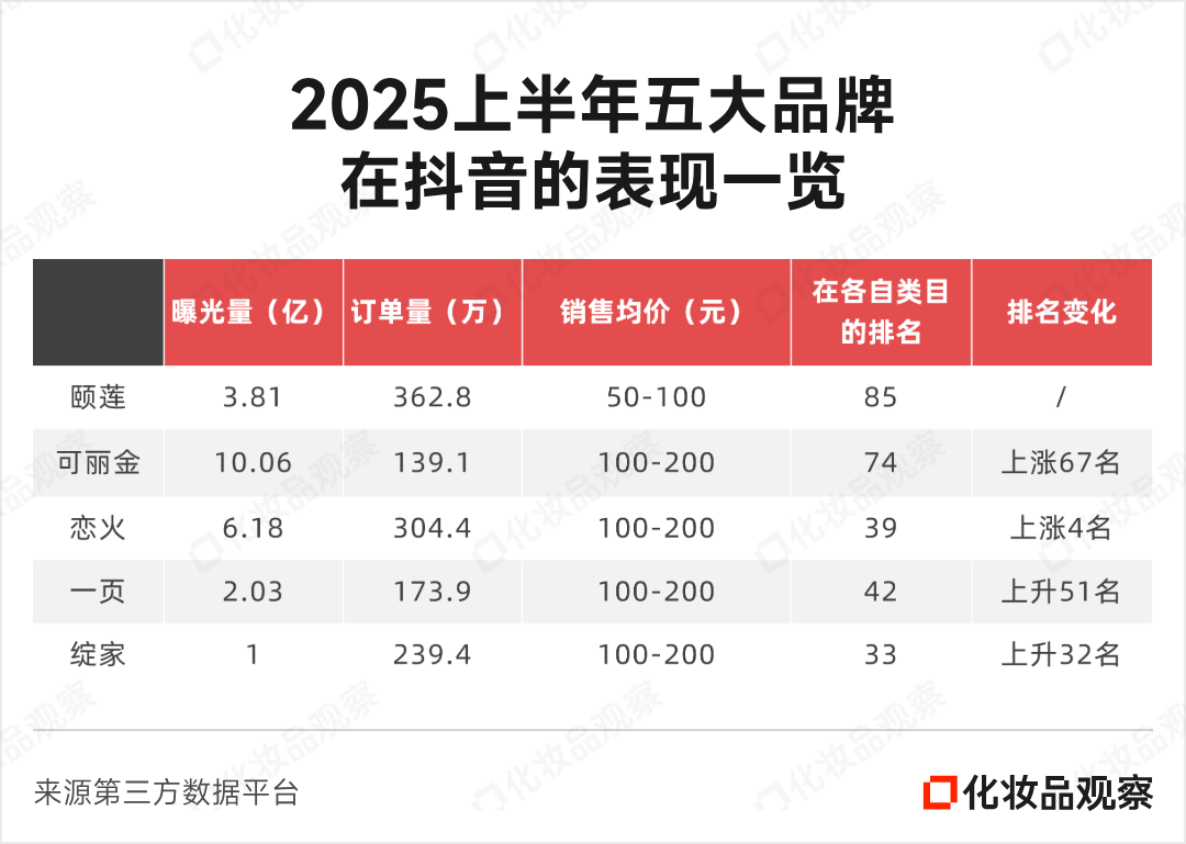 在抖音平台,多个品牌排名上涨。今年上半年,可丽金在抖音美妆类目的排名上涨67位,排在第74名;一页在抖音母婴类目排名上涨51位,排在第42名;绽家在抖音个护家清类目上涨32位,排在第33名。