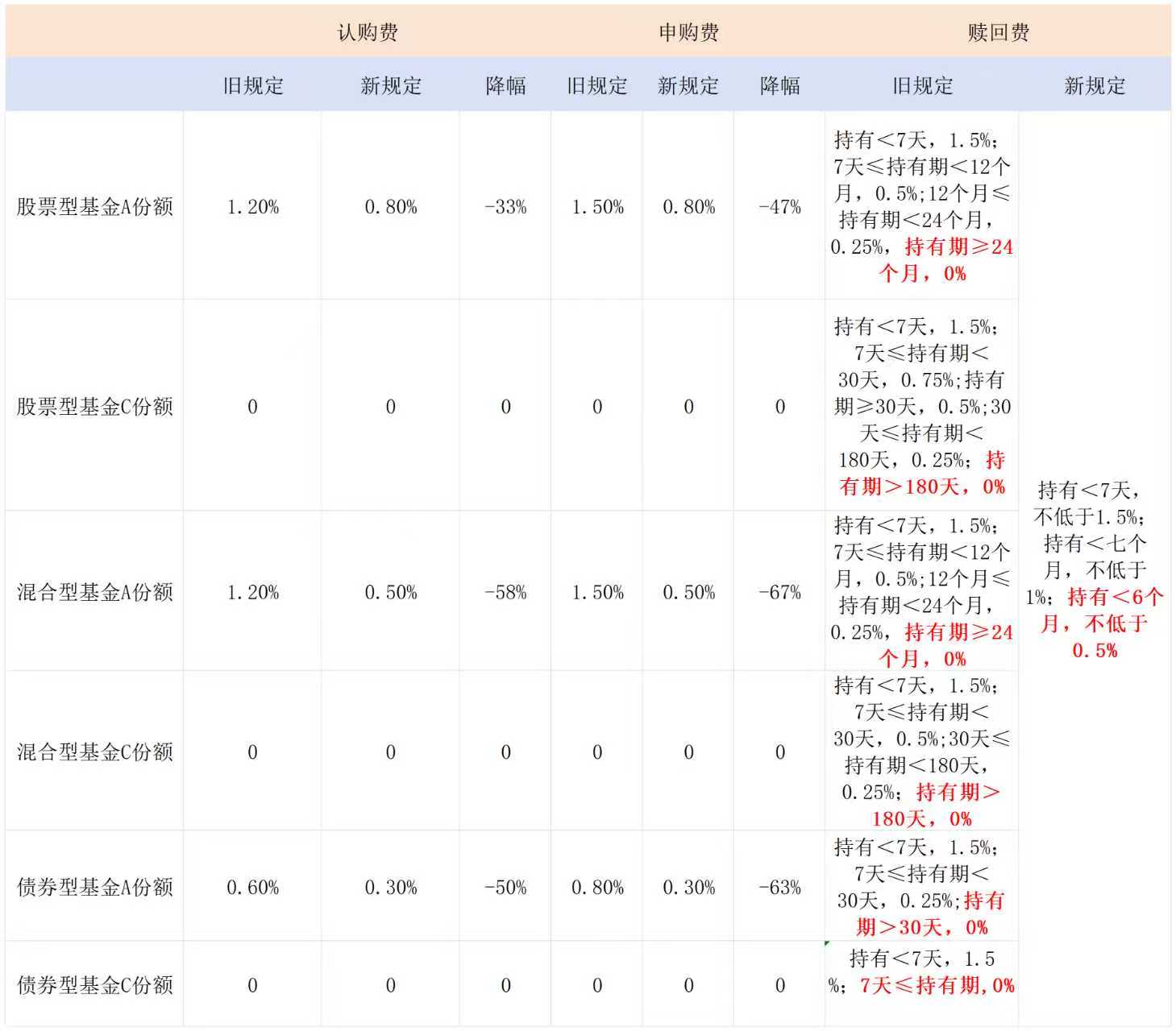 《征求意见稿》明确,股票型基金、混合型基金、债券型基金和FOF的投资者,当持续持有期<7天,收取不低于赎回金额1.5%的赎回费;对7天<持有期<30天的投资者,收取不低于赎回金额1%的赎回费;对30天<持有期<180天的投资者,收取不低于赎回金额0.5%的赎回费。