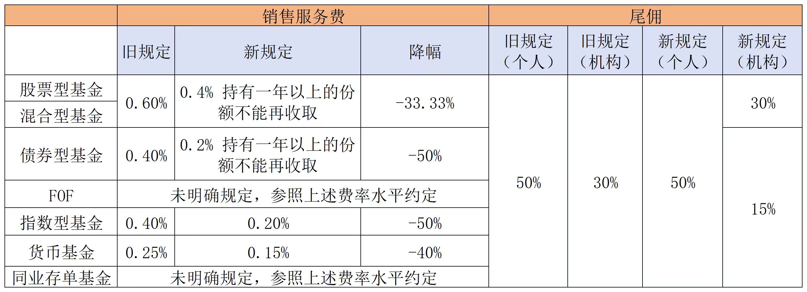 此外,《征求意见稿》还提到了对尾佣的调整,面向机构投资者销售形成的权益类基金保有量尾佣比例上限维持30%不变,而其他产品则下降一半。