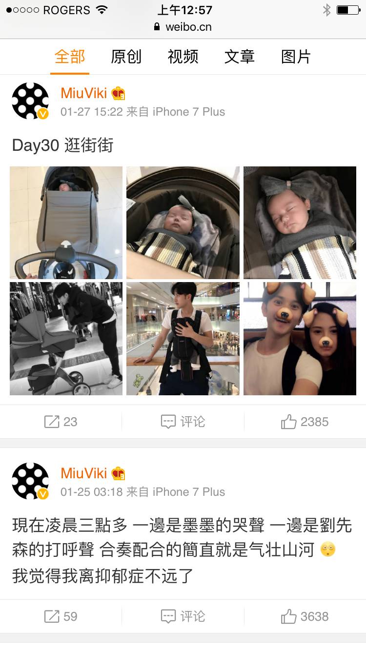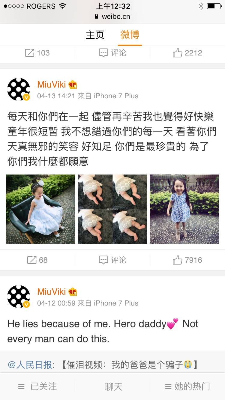 如果刨除微博最上面MiuViki发表的离婚声明,整个微博完全展示了一个美丽华裔女子的幸福生活。跟几年前我关注她时不一样,现在她当了妈妈,象任何一个爱孩子的小女人一样,MiuViki在网上最爱晒的就是她的孩子。先是秀气可爱的大女儿熙熙,穿着高质量高品格的漂亮裙装,连开着的小童车都是宝马牌子,完全是奢华的小公主生活。这个大女儿,从新闻报道中可以看出,是MiuViki和她的前任所生。去年底MiuViki又生下了第二个漂亮女儿墨墨,小宝宝睡着的照片、洗澡后的照片,都可爱得像个天使。
