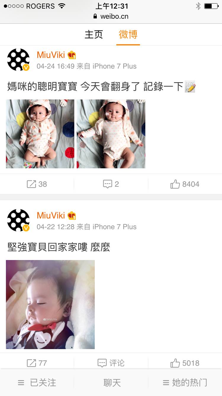 MiuViki在微博中成了一个幸福又忙碌的妈妈,对两个孩子的爱跃然纸上。