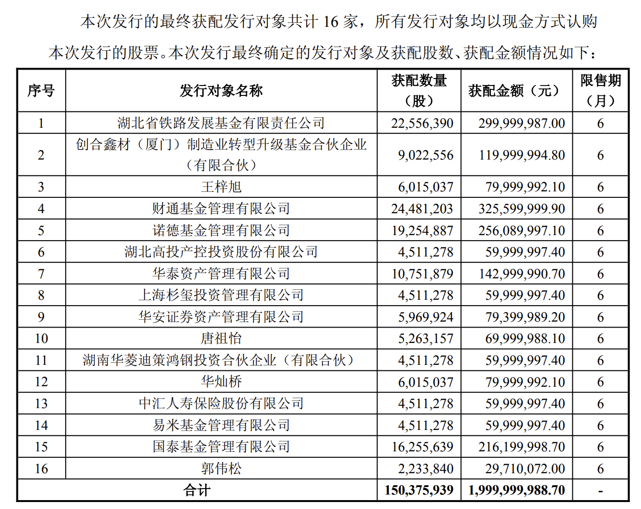 湘电股份9月12日晚间公告,本次向特定对象发行A股股票的数量为1.5亿股,发行价格为13.3元/股。发行募集资金总额为20亿,募集资金净额为19.79亿。本次发行对象共计16名,财通基金获配3.26亿元,诺德基金获配2.56亿元,华泰资管获配1.43亿元。