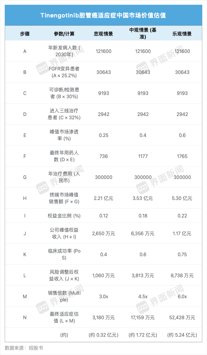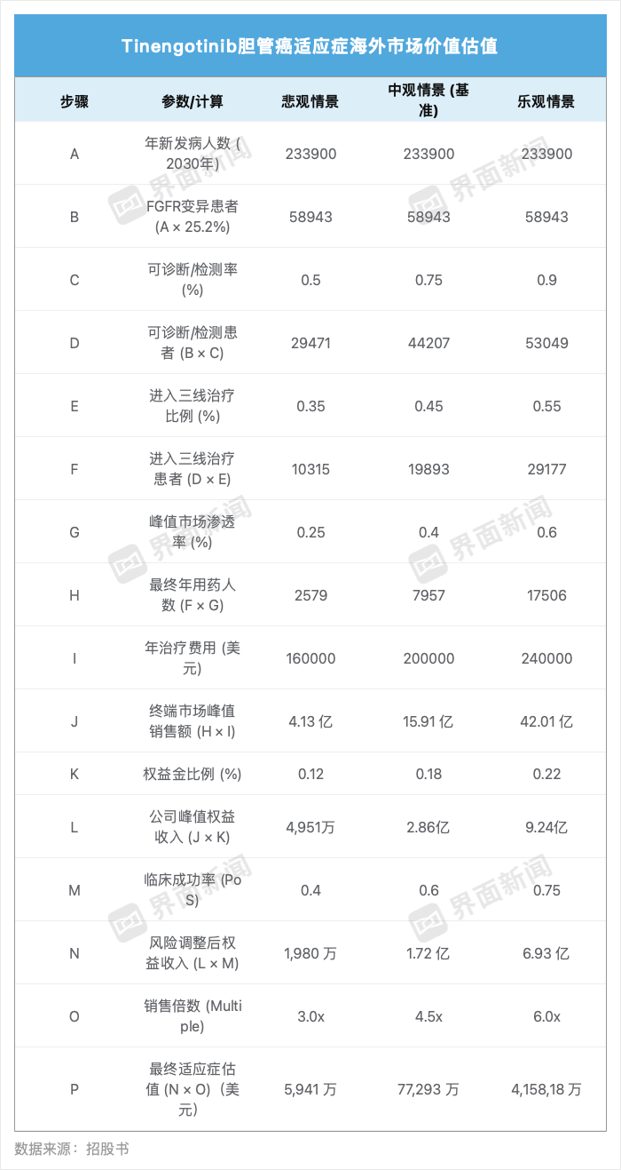 对于中国外的海外市场,界面新闻采用类似假设方法进行测算,Tinengotinib胆管癌适应症得出中性估值约55.65亿元人民币。
