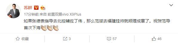 苏群曝范斌将执教福建 张德贵加盟北控任助教