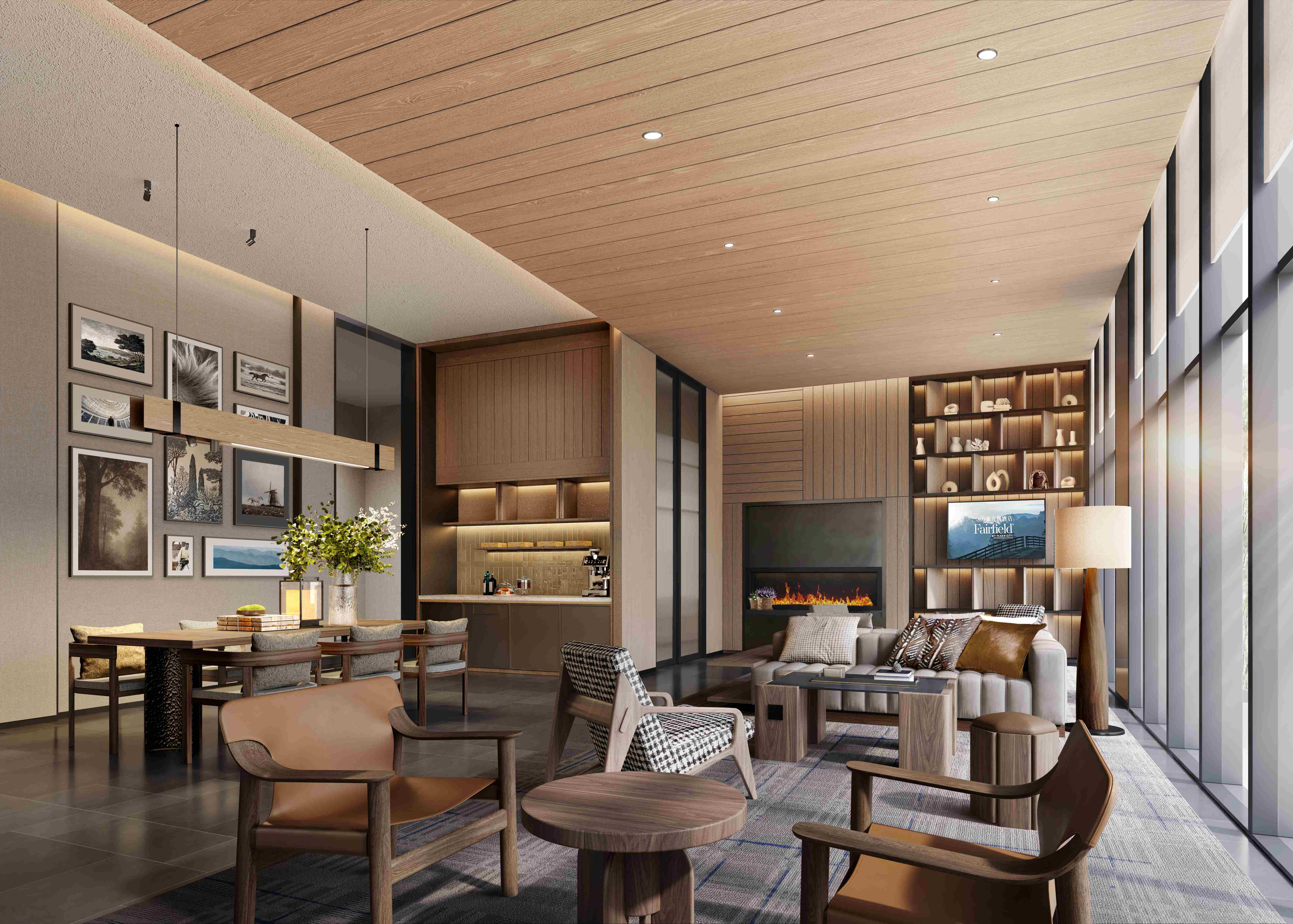焕新首先体现在空间设计的 “自然化” 表达上。走进万豪万枫酒店,超高挑高结合自然灯光与原木纹理,瞬间营造出自在放松的氛围;前台背景墙以 “推窗即景” 为灵感,将蓝岭山脉融入室内,仿佛身处自然中。