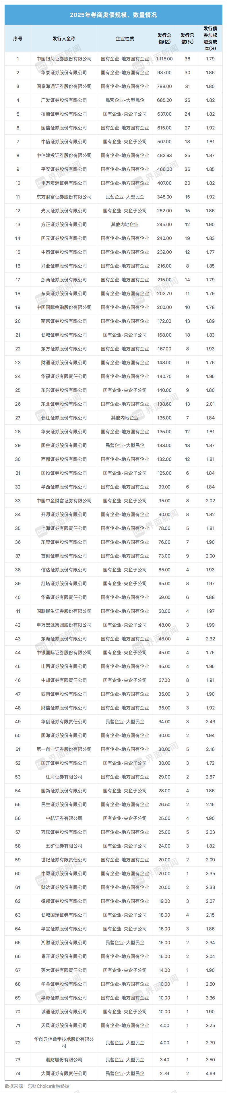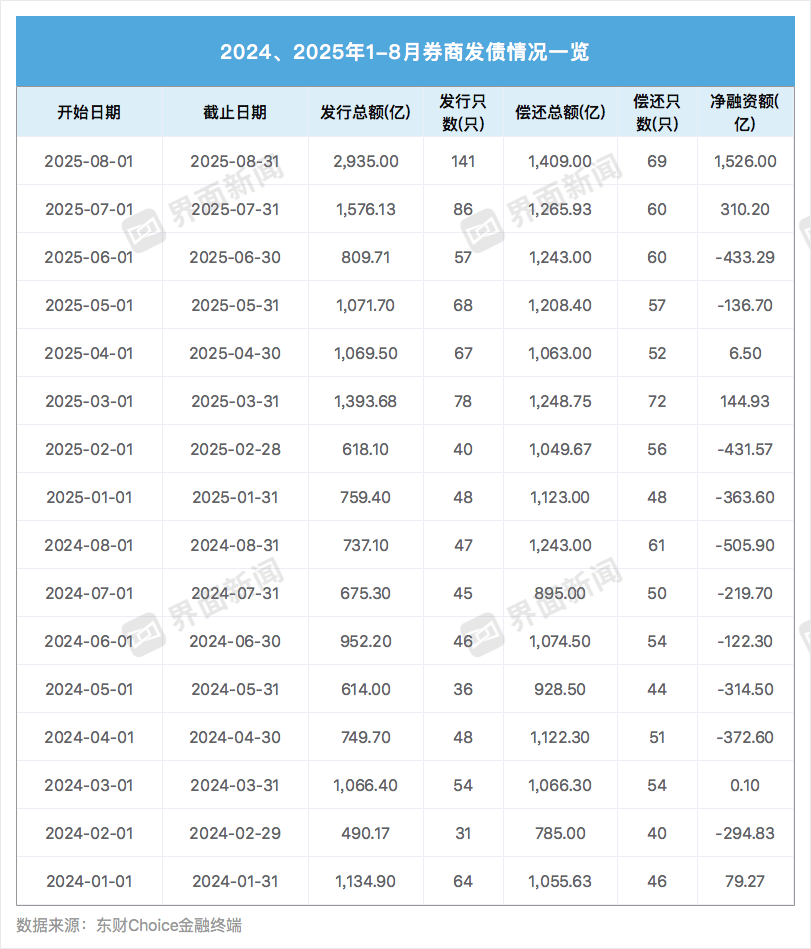 柏文喜对界面新闻称,“8月,3年期AAA券商债票面利率已降至2.2%附近,较去年同期降50BP,叠加监管鼓励科创债、永续次级债,券商趁‘便宜钱’加速发债,既可借新还旧降低财务成本,又能把长期负债直接计入净资本,一举两得。”