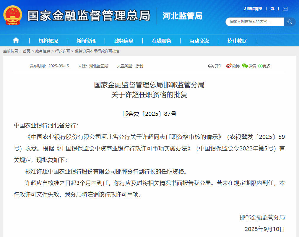 据国家金融监督管理总局河北监管局的批复文件显示,邯郸监管分局核准许超中国农业银行邯郸分行副行长的任职资格。