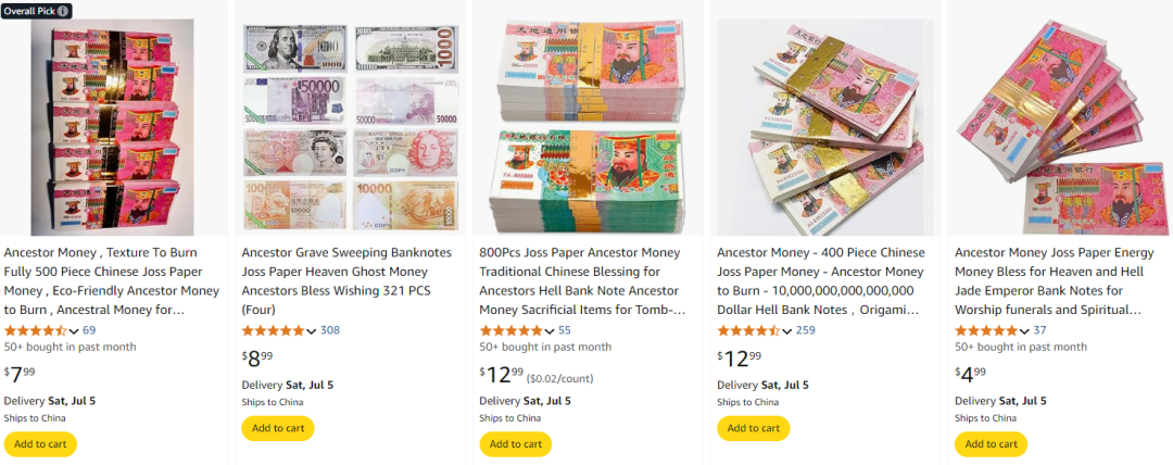 售价更是翻了数十倍,国内电商平台上几块钱能买到一千多张冥币,到了亚马逊,800张竟卖到13美元。